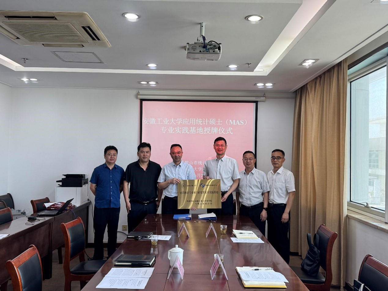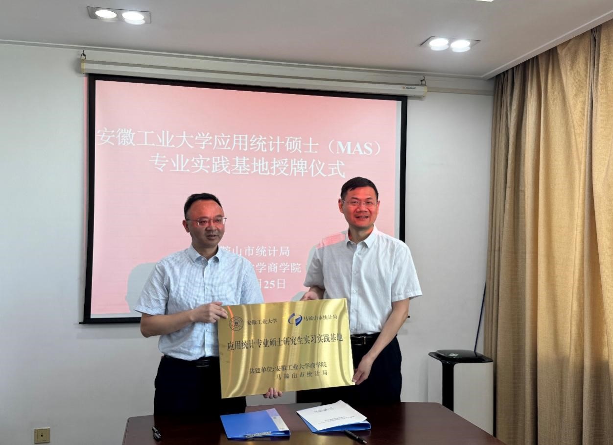 6月25日上午,安徽工业大学应用统计硕士研究生实习实践基地签约授牌仪式在马鞍山市统计局举行。马鞍山市统计局党组书记、局长汪学峰,安徽工业大学必赢76net线路唯一官方网站党委副书记、院长章铁生出席仪式并代表双方签约。市统计局党组成员、副局长方鹏辉,党组成员、总统计师杨帅,必赢官网副院长周世军、应用统计教育中心主任崔立志等参加仪式。