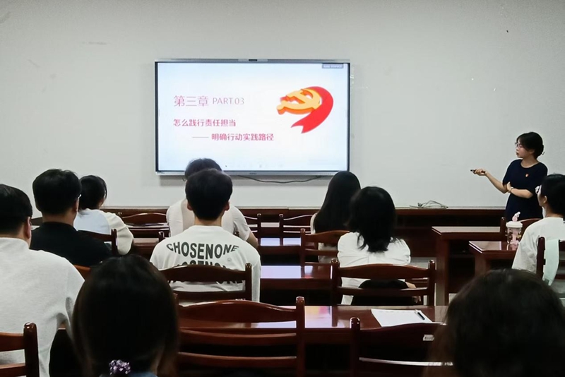 活动最后,肖梦雨从政治、学业、服务、纪律四个方面,为学生党员明确了践行责任担当的具体实践路径。一是讲政治,做信念坚定的“明白人”。主动学习党的创新理论,跟进时事政策,定期参与理论研讨,始终保持政治清醒与思想坚定,让理想信念成为成长的“压舱石”;二是讲学业,做勤学笃实的“带头人”。不仅要攻克专业难点、追求学业优异,更要主动分享学习经验、帮扶学业困难同学,带动班级形成“比学赶超”的优良学风;三是讲服务,做心系同学的“贴心人”。聚焦同学“急难愁盼”,积极参与班级管理、校园志愿服务,利用课余时间投身社区公益、乡村振兴实践,让“为人民服务”融入日常;四是讲纪律,做严于律己的“规矩人”。严格遵守校规校纪与党的纪律,杜绝迟到早退、学术不端等行为,自觉维护党员形象,做“纪律自觉、作风优良”的践行者。