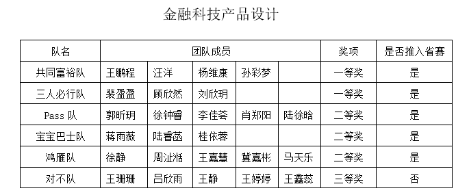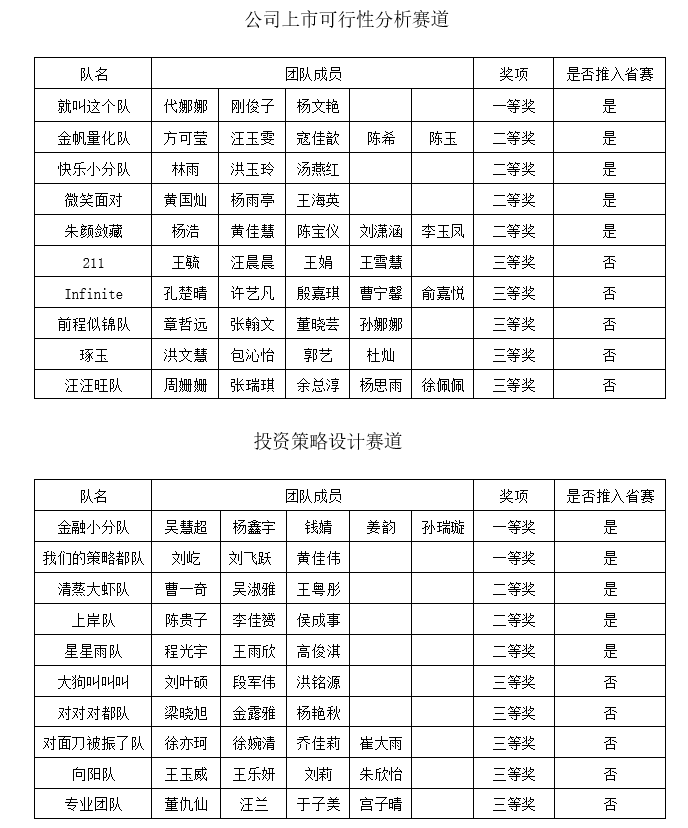 根据组委会公布数据,除了股票虚拟仿真交易项目外,其它三个比赛项目,我校晋级省赛的名额均为5个。根据专家评审结果,拟推荐以下十五支队伍进入省赛:就叫这个队、金帆量化队、快乐小分队、微笑面对、朱颜敛藏、金融小分队、我们的策略都队、清蒸大虾队、上岸队、星星雨队、共同富裕队、三人必行队、pass队、宝宝巴士队、鸿雁队、对不队。
