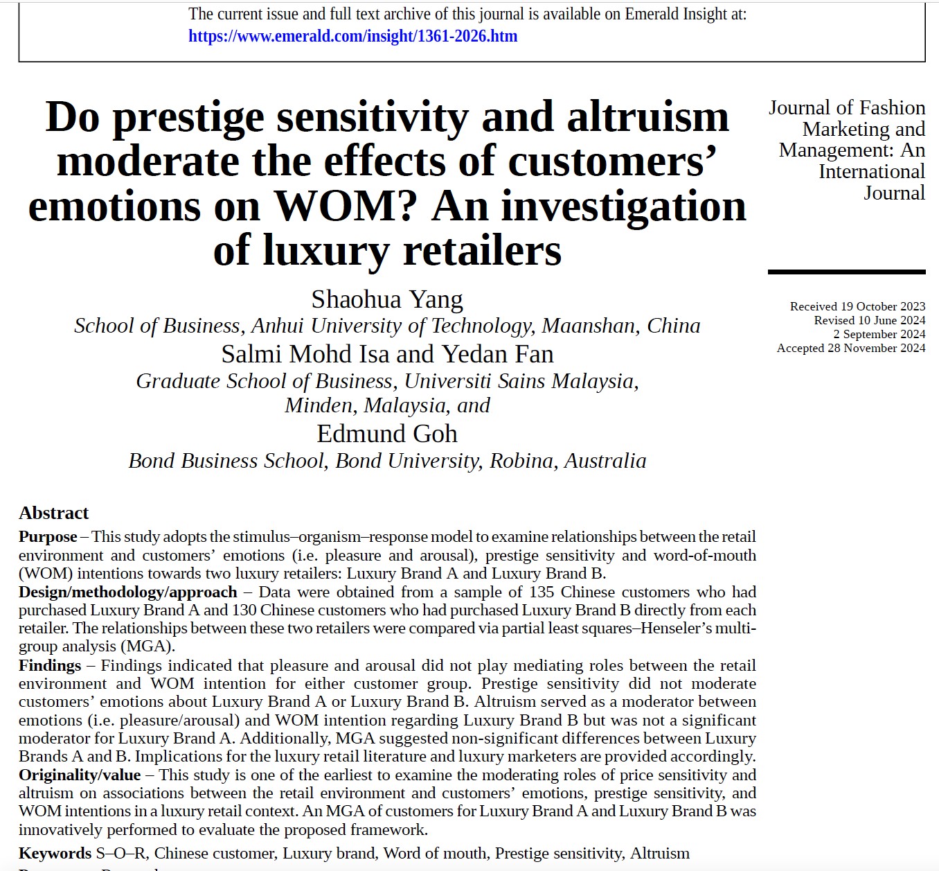 近日,必赢官网杨少华副教授以第一作者身份在国际知名期刊《Journal of Fashion Marketing and Management》(简称JFMM,中文名《时尚营销与管理杂志》)上发表了一篇题为《Do prestige sensitivity and altruism moderate the effects of customers’ emotions on WOM? An investigation of luxury retailers》的学术论文。合作作者包括马来西亚理科大学的樊烨丹博士和澳大利亚邦德大学的Edmund Goh教授,必赢官网为该论文的第一单位。JFMM是一份致力于时尚营销与管理领域实证研究的国际知名期刊,在JCR排名中属于SSCI二区,最新影响因子为3.2。该期刊旨在传播时尚营销与管理领域的前沿知识,涵盖可持续发展、社会责任和数字化创新等主题。