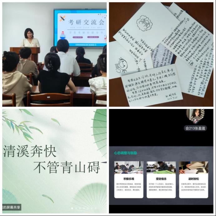 会议邀请支部优秀毕业生党员、考研成功上岸的陈子昊同学进行经验分享。他着重从考试类别、考试科目及心态调整等方面介绍了备考技巧,提醒大家要明确目标、有的放矢、把握节奏、松弛有度。他以“清溪奔快,不管青山碍”的诗句鼓励大家勇敢前行,不畏艰难险阻,怀揣梦想与信念,以坚韧不拔的毅力,跨越备考路上的每一道难关。支部党员还为备考同学精心制作了明信片,祝福大家一战成硕。