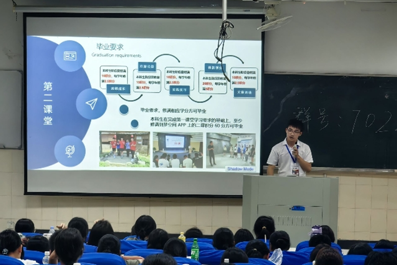会议伊始,王杰发表讲话,对参加宣讲会的新生们表示欢迎,他简要介绍了第二课堂项目的意义和目的,并详细介绍第二课堂项目的种类、参与方式、学分认定等内容。此外,到梦空间作为第二课堂发挥作用的载体,宣讲人员从策划书及申请表的撰写到活动的发布、进行及完结,对其进行了详细的介绍。对于活动申请中会遇到的各种问题,补录、小黑屋等情况也给出了相应的解决方案。在现场问答环节,同学们针对第二课堂项目积极提出疑问,踊跃发言,由宣讲团成员进行耐心解答。会议最后,王杰对本次宣讲会进行总结,强调第二课堂项目的重要性,鼓励同学们积极参与。