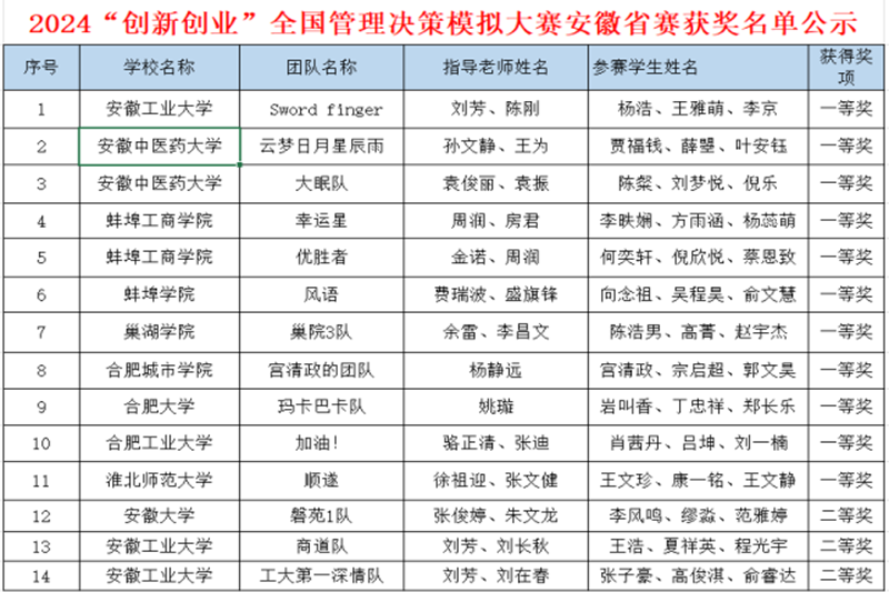 近日,2024年安徽省“创新创业”全国管理决策模拟大赛圆满落幕,安徽工业大学必赢76net线路唯一官方网站三支参赛队伍大放异彩,斩获佳绩。在总决赛中,刘芳、陈刚指导的Sword finger队凭借卓越表现荣获一等奖;刘芳、刘长秋指导的商道队及刘芳、刘在春指导的工大第一深情队也分别荣获二等奖,为校争光。