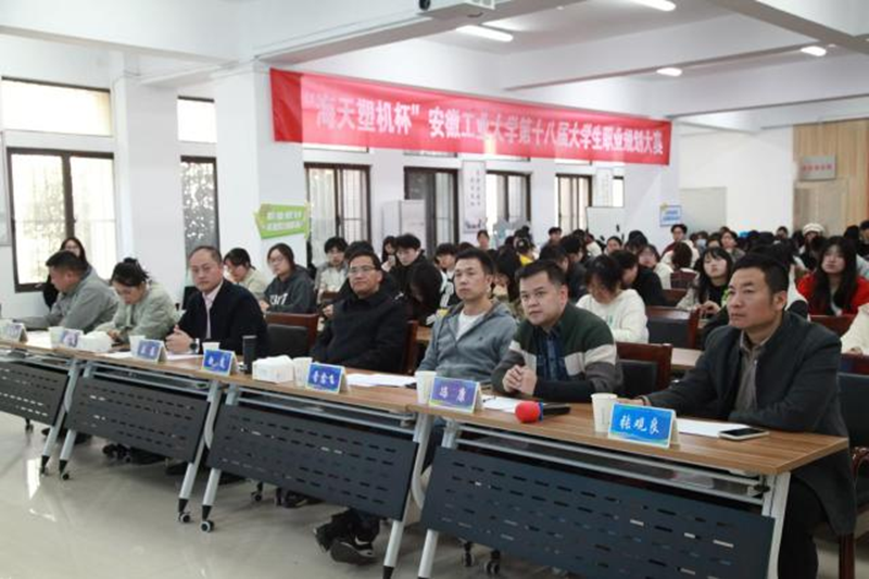 本次大赛有幸邀请到安徽工业大学学生工作部(处)部长、大学生就业创业指导中心主任赵龙,马鞍山学院就业指导中心主任王磊,皖江工学院管理学院副院长、党总支副书记冯康,马鞍山师范高等专科学校就业指导中心主任晋愈飞,新安人才网马鞍山分公司总经理刘丹,马鞍山方圆精密机械有限公司的人力资源总监、安徽工业大学校友张观良,安徽创杰环境科技有限公司董事长、安徽工业大学校友王文祥莅临指导。同时,我们邀请海天塑机集团人力资源部张程斐部长进行线上评审。参赛选手以及感兴趣的同学共130余人参加了比赛。