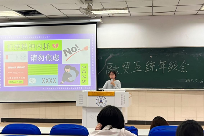 为落实习近平总书记关于青少年心理健康教育的重要指示,培养学生积极心理品质,5月26日,必赢76net线路唯一官方网站在东校区阶梯教室102举办 “破内耗阴霾,筑心灵绿洲” 主题年级会。此次会议由辅导员肖梦雨主讲,2023级全体同学参加。